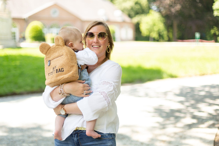 Zainetto funzionale/con fibbia di sicurezza del brand Childhome . Il colore dominante è marrone .