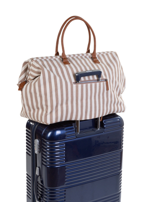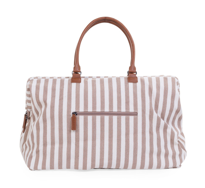 Zaino e borsa capiente/con fasciatoio/funzionale Mommy Bag del brand Childhome . Il colore dominante è beige/avorio/marrone con righe .