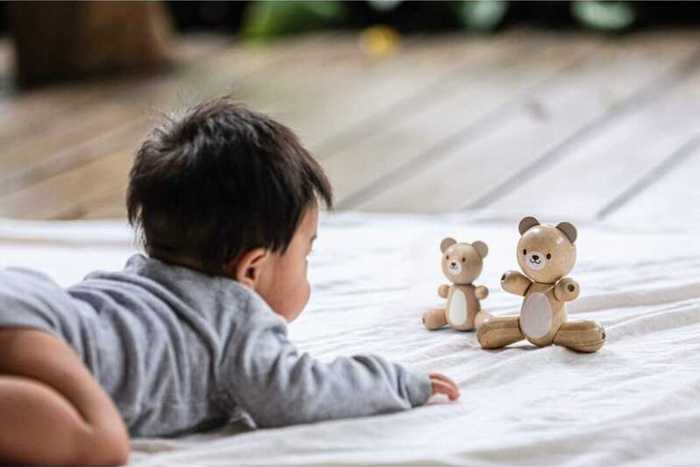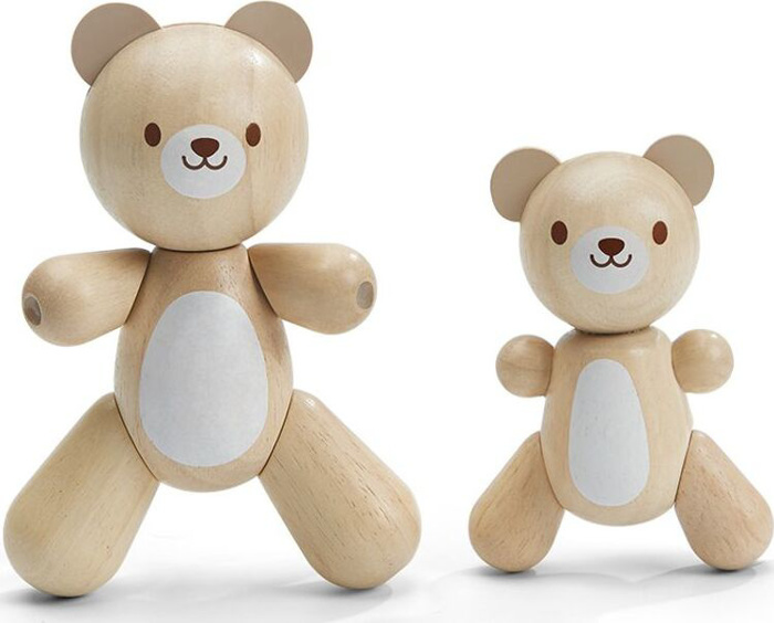 Gioco in legno sostenibile/stimolante Bear & Little Bear del brand PlanToys . Il colore dominante è beige/bianco con orsi .
