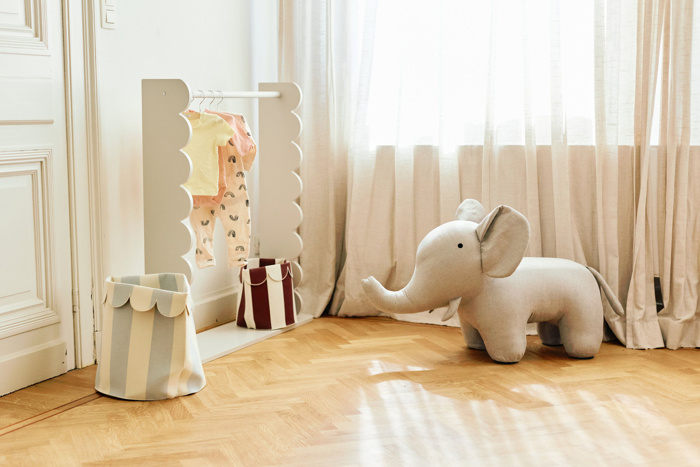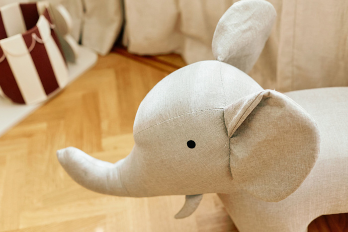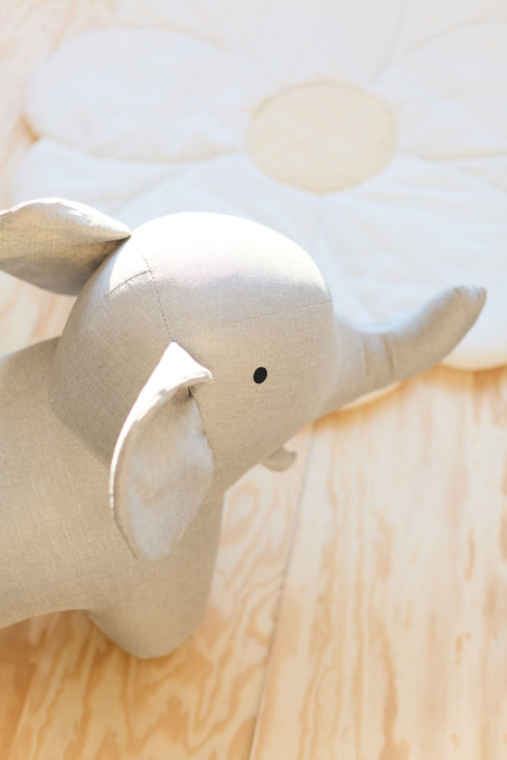 Gioco morbido cavalcabile Elefante del brand Childhome . Il colore dominante è grigio con elefante .