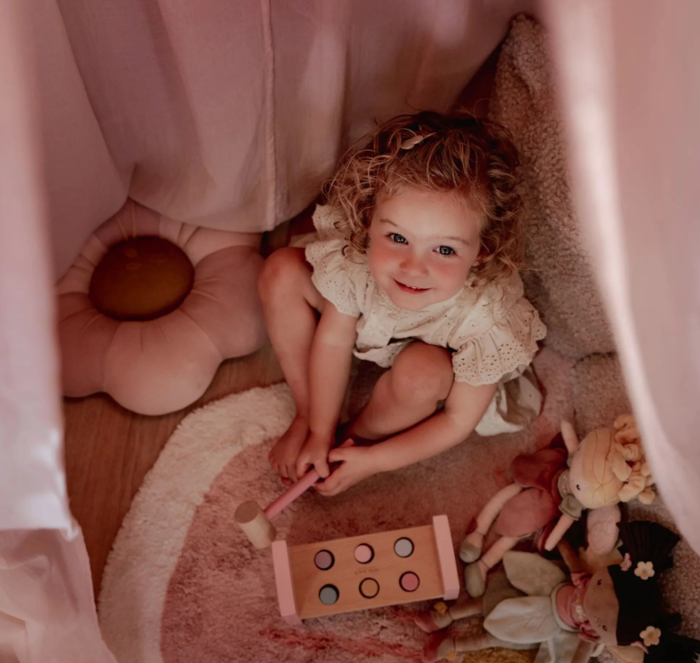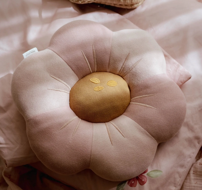 Cuscino soffice/confortevole del brand Little Dutch . Il colore dominante è beige/rosa con fiori .