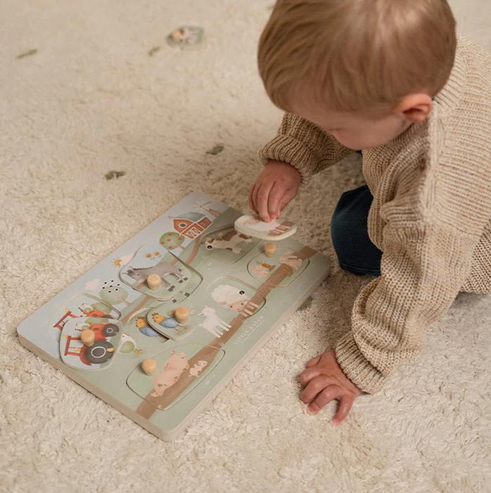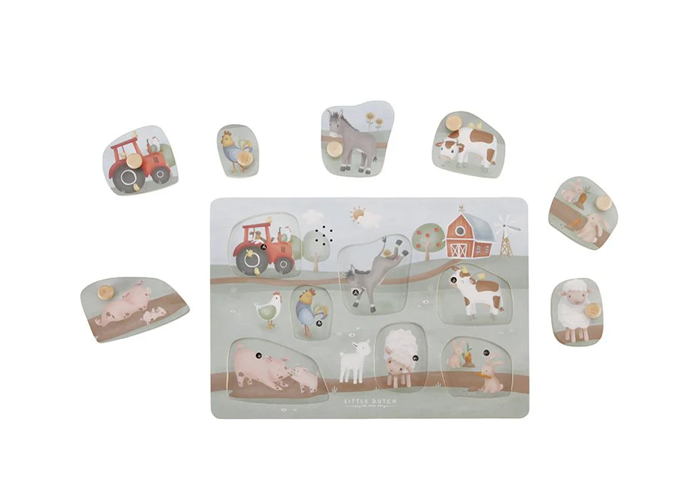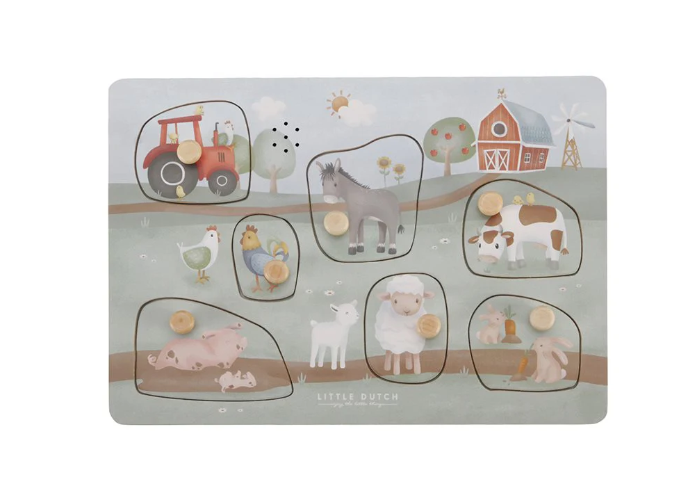Gioco a incastro sonoro del brand Little Dutch della collezione Little Farm. Il colore dominante è multicolore con animali .