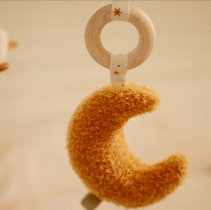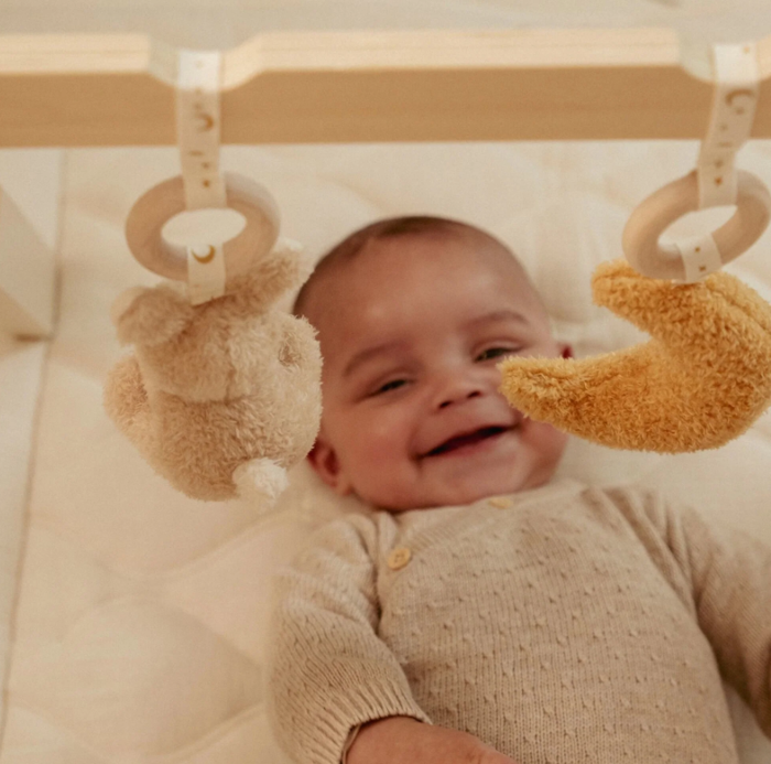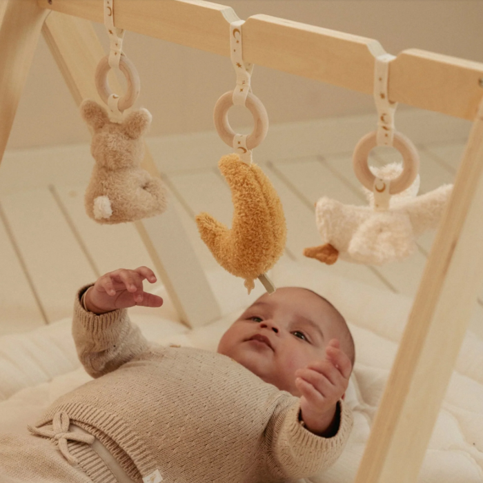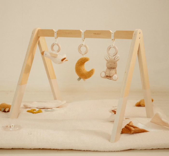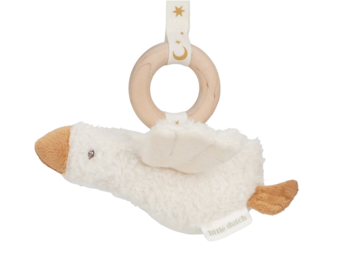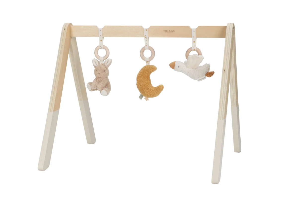 Palestrina stimolante/con peluche/in legno del brand Little Dutch della collezione Baby Bunny Little Goose. Il colore dominante è avorio/ocra .