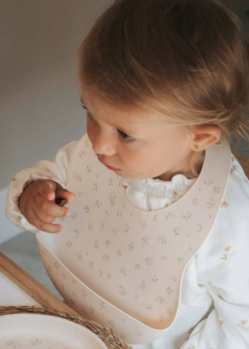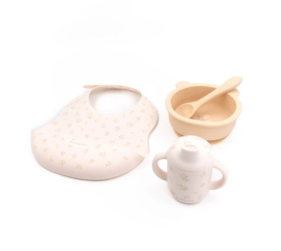 Set Pappa in silicone Tulips del brand Bamboom . Il colore dominante è avorio/rosa .